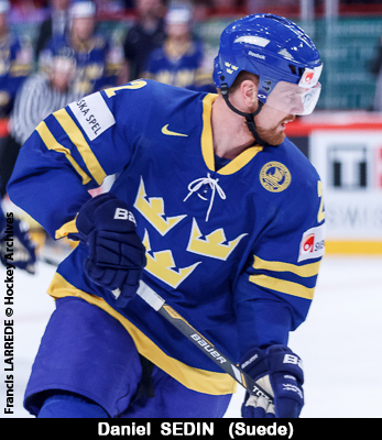 Attaquants : Alexander Steen (-3) – Patrik Berglund (C, -1, 2′) – Daniel Alfredsson (A, -1) ; Daniel Sedin (-2) – Jimmie Ericsson – Loui Eriksson (-2) ; Gabriel Landeskog (A) – Marcus Johansson – Jakob