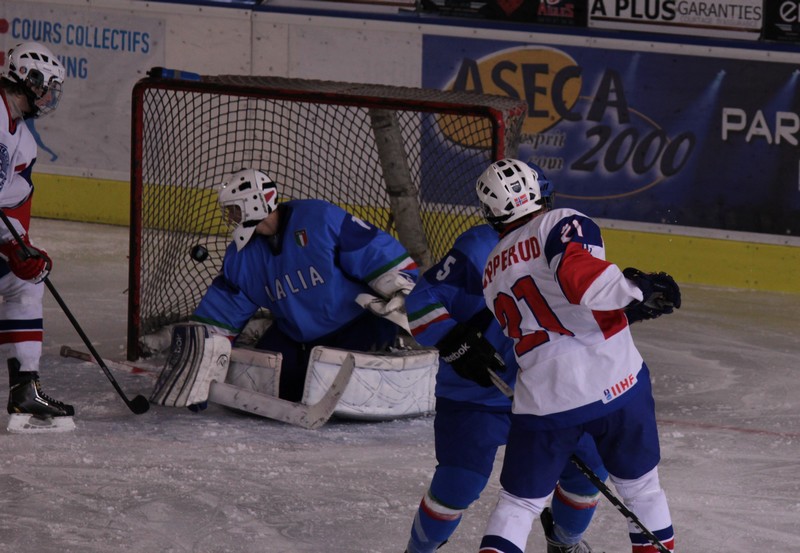 Sur l’engagement, l’incursion italienne en attaque expédie Gronstad sur le banc des punis. Les Transalpins s’installent mieux. Lambacher décoche le premier tir du cercle droit, puis la défense norvégienne prend le dessus. Hoff et Lindstad parviennent à conserver le palet et, au retour à cinq, les deux hommes multiplient les passes. Lindstad trouve alors Hoff, oublié au marquage plein axe, pour une volée mi-hauteur au ras du poteau (2-0 à 11’33 »).
