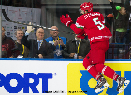 À la mi-match, le Bélarus piège le Kazakhstan sur un changement de joueurs. Depuis sa ligne de fond, Roman Graborenko trouve le relais de Stepanov à la ligne bleue qui remet aussitôt dans l’axe à Nikolaï Stasenko. Oui, le pur défenseur Stasenko, qui n’a pas marqué le moindre but en compétition officielle depuis cinq ans – en club ou en sélection – et qui ne manque pas cette chance de se retrouver seul face à la cage (2-1, photo de droite). Tellement heureux de ce but, il se jette contre le plexi qui en vibre – et 15000 supporters vibrent avec lui.