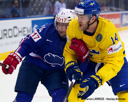 Gustav Nyquist (attaquant de la Suède) : « La saison a été longue mais on ne refuse pas de jouer pour son pays. Je ne suis pas aussi frais qu’il y a un mois ou deux. Il y a beaucoup de jeunes, qui sont frais et aiment patiner. Le groupe s’entend bien, il y a une bonne alchimie et nous nous amusons bien. Le jeu n’est pas encore au niveau où nous voudrions qu’il soit, mais nous continuons à trouver des moyens de gagner. Ce soir, nous savions que cela serait compliqué. La France a des joueurs rapides et joue bien en contre-attaque. La performance de la France n’est pas vraiment une surprise, car chaque équipe aligne de bons joueurs et il n’y a plus de matchs faciles. Les gens doivent comprendre qu’il faut jouer à 100% et batailler dur pour gagner un match dans ce Mondial. Nilsson sort un gros arrêt en fin de match, sans lui nous n’aurions jamais gagné dans le temps réglementaire. Il est une des raisons majeures de la victoire ce soir. »