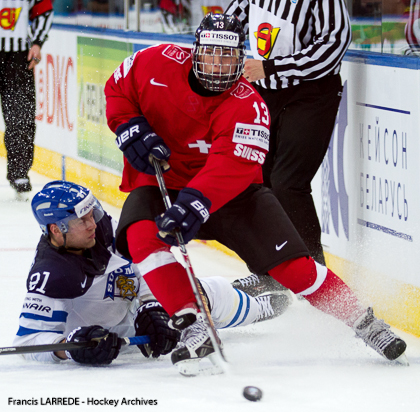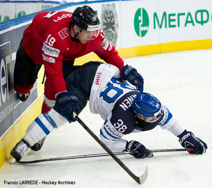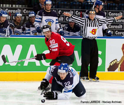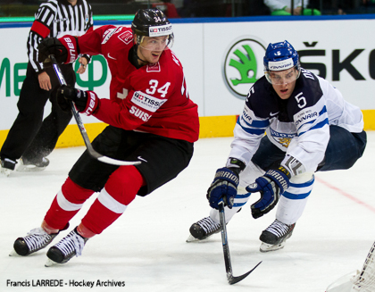 La rencontre est très fermée et l’on compte les tirs cadrés sur le doigt d’une main après douze minutes. Ceci dit, la Finlande parvient mieux à déployer son jeu de passe et s’octroie quelques situations intéressantes. Les tirs filent à côté des cages, notamment un lancer d’Huhtala après une combinaison en triangle parfaitement exécutée. Un Huhtala décidément très en vue, puisqu’il inflige une sévère mise en échec pleine glace à Damien Brunner au quart d’heure de jeu.