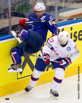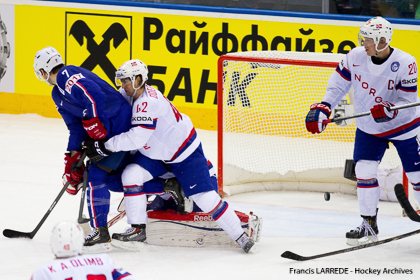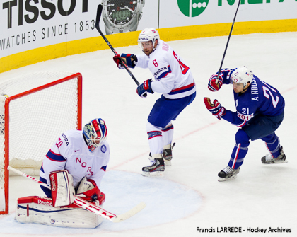 La deuxième période débute… encore plus mal. La France se piéger à un changement, et Mathis Olimb trouve une longue passe le long de la bande opposée pour son frère Ken André qui centre pour Morten Ask lancé dans l’axe. Damien Fleury revient en catastrophe pour empêcher le Norvégien de tirer, mais du coup il contre du patin cette rondelle… qui glisse lentement vers la cage alors que Ask a percuté de plein fouet Cristobal Huet, légitimement furieux ! Les arbitres accordent pourtant directement le but (0-2, photo de droite).