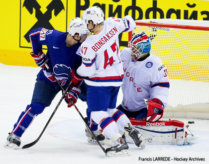 Les premières pénalités tombent. Après le cinglage d’Olden, le premier bloc français s’installe bien, pas le second. Avec Meunier en prison pour crosse haute, les Norvégiens sont plus dangereux, avec un rebond pour Bastiansen, puis un tir d’Alexander Bonsaksen, servi entre les cercles par une passe du revers de Ken Andre Olimb qui a sorti le palet du coin.