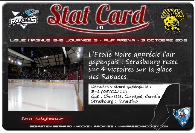 Gap – Strasbourg. Spécialiste des gros débuts de saison, l’Étoile Noire est toujours invaincue après deux journées de Ligue Magnus. Et pourtant, la formation alsacienne n’a pas attaqué son championnat par le côté le plus facile. Grenoble vaincu sur sa glace (3-4), Angers dominé en prolongation (5-4)… Alors Gap ? Même pas peur, pour Strasbourg. Surtout que les joueurs de Daniel Bourdages ont remporté leurs quatre derniers déplacements dans les Hautes-Alpes (2-4 en 2011/2012, 1-4 en 2012/2013, 1-5 en 2013/2014 et 1-4 en 2014/2015). Une série qui ne plaît guère à Luciano Basile. L’entraîneur gapençais compte bien y mettre un terme. Ce sera sans doute sans Jérémy Baridon, blessé dans la semaine en Coupe de la Ligue. Et sans doute, aussi, sans Evan Mosher. Le nouveau gardien des Rapaces devrait patienter encore quelques jours avant de débuter sous les couleurs gapençaises.