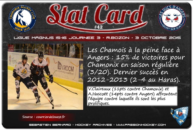 Chamonix – Angers. Les Chamois ont retrouvé l’élite du hockey hexagonal en septembre 2005. Depuis, à chaque fois qu’Angers se présente sur la glace de Richard-Bozon, les Haut-Savoyards passent une sale soirée. C’est simple : les Angevins ont remporté neuf de leurs dix derniers déplacements au pied du Mont-Blanc. Et la seule victoire chamoniarde remonte à la saison 2012/2013 (3-1). Cette belle dynamique, les Ducs vont tenter de la conserver. Avec un nouveau gardien, puisque Raphaël Girard a remplacé Charles Lavigne dans le courant de la semaine. Stéphane Gros, lui, devra composer sans Matthias Terrier. L’attaquant, exclu en Coupe de la Ligue contre Dijon, a écopé de cinq matchs de suspension, dont deux avec sursis.