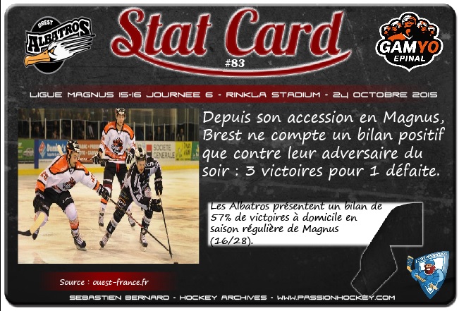 Brest – Épinal. La saison d’Épinal avait plutôt mal commencé. Mais depuis leur défaite à Lyon (5-4) début septembre, les Gamyo réalisent un sans-faute. Vainqueurs coup sur coup de Gap (5-2), Bordeaux (1-2 ap), Briançon (4-3 ap) et Amiens (4-3), les Vosgiens veulent maintenant enchaîner avec un cinquième succès d’affilée. Seulement, la tâche risque d’être rude. Car c’est à Brest qu’ils se déplacent. Toutes compétitions confondues, les Albatros n’ont été battus cette année qu’une seule fois sur leur glace du Rïnkla Stadium (1-4 contre Angers le 6 octobre en Coupe de la Ligue). Surtout, les Bretons gardent un excellent souvenir de leurs dernières confrontations face aux Spinaliens. Épinal est la seule équipe qu’ils avaient battue à deux reprises en saison régulière l’an passé (3-2 ap à l’aller puis 1-2 au retour). Remis de sa blessure à la main, Andrej Hocevar fera son retour dans la cage vosgienne. Coupé par le staff spinalien et récupéré depuis par Brest, Lukas Kralik devrait, lui, être revanchard face à son ancien club.