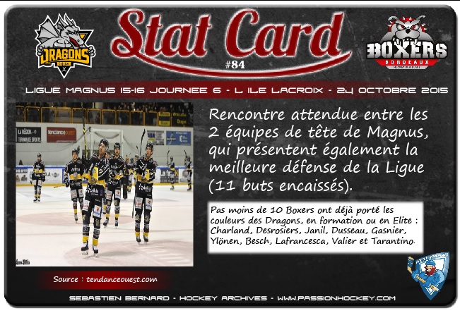 Rouen – Bordeaux. C’est le choc de cette 6e journée. Leader et meilleure attaque du championnat (28 buts marqués), Rouen accueille ce soir son dauphin : Bordeaux, surprenant promu et co-meilleure défense de l’élite (11 buts encaissés, à égalité avec… Rouen). Au classement, les deux équipes comptent le même nombre de points (12). Elles ne sont, en fait, départagées qu’à la différence de buts (+17 pour Rouen, +7 pour Bordeaux). Côté bordelais, la rencontre sera forcément chargée d’émotion puisque onze Boxers ont un jour porté le maillot des Dragons (l’entraîneur Martin Lacroix ; les gardiens Mickaël Gasnier et Sébastian Ylönen ; les défenseurs Kevin Dusseau, Nicolas Besch et Jonathan Janil ; les attaquants Gautier Lafrancesca, Julien Desrosiers, Peter Valier, Francis Charland et Lionel Tarantino). Les deux formations se sont déjà croisées cette saison. Courant août, lors du Summer Ice Trophy, les Bordelais avaient dominé les Normands (5-2). Depuis, beaucoup d’eau est passée sous les ponts, côté Garonne comme côté Seine. Vexés par leur défaite lors de leur dernière sortie à l’île Lacroix (3-4 contre Gap), les Dragons veulent reprendre la main à domicile. Encore invaincus à l’extérieur après leurs succès à Briançon et Dijon, les Aquitains passent eux leur premier vrai test de l’année face à l’un des ténors de l’élite. Un test qu’ils attaquent au complet. Rouen, à l’inverse, devra une nouvelle fois se débrouiller sans Tero Konttinen. Le défenseur finlandais souffre toujours du genou.