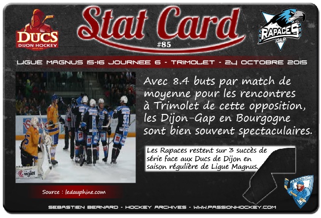 Dijon – Gap. Deux matchs, deux défaites. À domicile, les Ducs n’y arrivent pas. Lanterne rouge, plus mauvaise défense (23 buts encaissés) et équipe la plus pénalisée du championnat (132 minutes), Dijon doit vite se relancer pour ne pas se retrouver définitivement à la traîne. Les Bourguignons viennent de prouver qu’ils en sont capables. Mardi soir, ils ont blanchi Lyon à Charlemagne (0-4) lors du match aller des quarts de finale de la Coupe de la Ligue. Seulement, ce soir, c’est Gap qui se présente à Trimolet. Une patinoire qui n’impressionne guère les champions de France en titre. Ils s’y étaient imposés à deux reprises la saison passée (1-3 en saison régulière puis 2-6 en play-offs). Les Rapaces, dominés samedi dernier par Angers (1-3), ont aussi besoin de grappiller des points pour se rapprocher du haut de tableau.