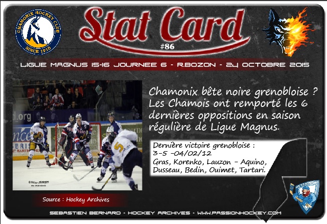 Chamonix – Grenoble. Les Chamois attendent Grenoble avec impatience. Mal partis en championnat, les joueurs de Stéphane Gros ont besoin de retrouver le chemin du succès après quatre revers de rang, histoire de reprendre au moins un peu confiance. Et comme les Chamoniards restent sur six victoires de suite en saison régulière face aux Brûleurs de Loups… Un septième succès, et les Haut-Savoyards seraient relancés. Seulement, le Grenoble nouveau est jusqu’ici impérial en déplacement. Les Isérois se sont déjà imposés à Dijon (1-6) et à Angers (1-5) cette année.