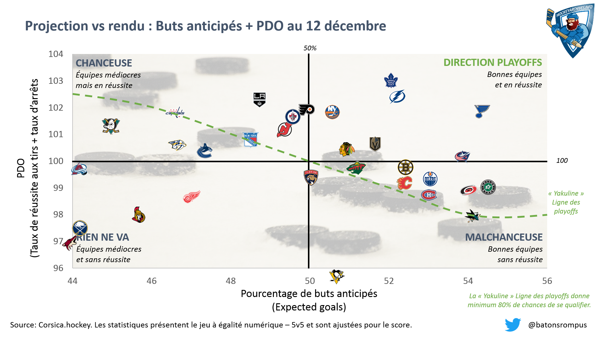 Voici quelques semaines, nous avions analysé dans cet article la recette à emprunter entre être bon ou être chanceux pour se qualifier en playoffs. La réponse simple était une balance des deux ou les deux… Comme vous le savez peut-être, nous utilisons chaque semaine un graphique rappelant ces deux dimensions afin de situer les équipes NHL et leur progression actuelle. Et bien ce rappel visuel vient de s’améliorer, nous l’espérons pour plus de clarté.