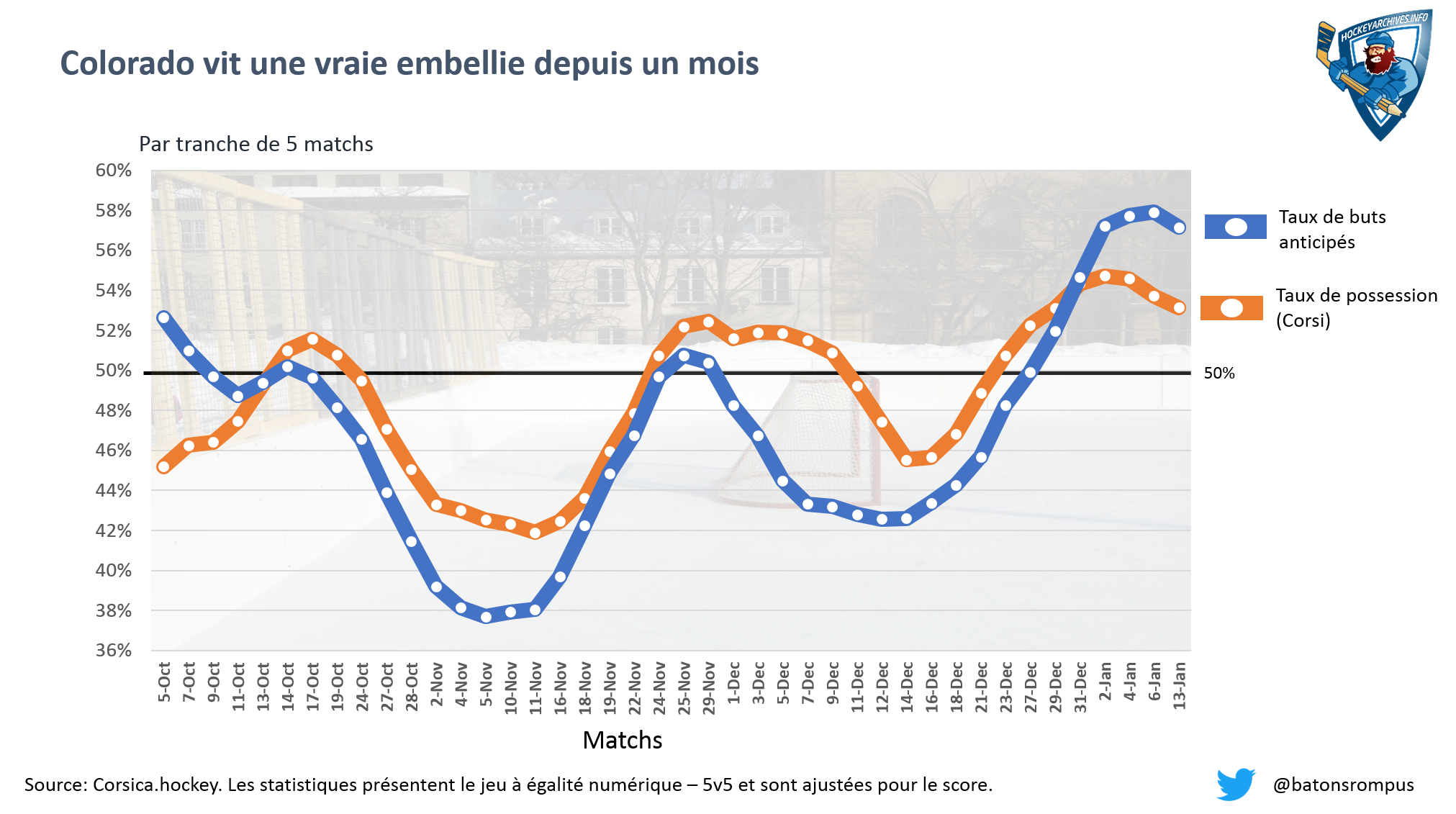 Colorado : Personne ne les attendaient encore dans la course aux séries à la mi-saison. Le DG Joe Sakic a enfin trouvé preneur pour Matt Duchene au prix voulu, la banque de prospects est pleine et la reconstruction avance à petits pas. Depuis le début de la saison, Colorado est statistiquement la moins forte de nos quatre équipes prétendantes. La possession et surtout les buts anticipés sont largement négatifs, et il est visible que l’équipe s’accroche à la queue du peloton grâce à ses unités spéciales, qui offrent un différentiel de +7 buts, et un PDO gonflé par la réussite des tireurs, 6e de la ligue au shooting %. Mais le fait est que les Avs cognent pourtant à la porte du printemps, tiré par un Nathan MacKinnon (enfin) au sommet de son art. Ils restent sur 7 victoires consécutives tout en offrant un visage assez alléchant. Alors, mirage ? Et bien pas tant que ça. Car sur les 20 derniers matchs, Colorado a bien redressé la tête, et corrige petit à petit un début de saison statistiquement catastrophique et copié-collé de l’an dernier.