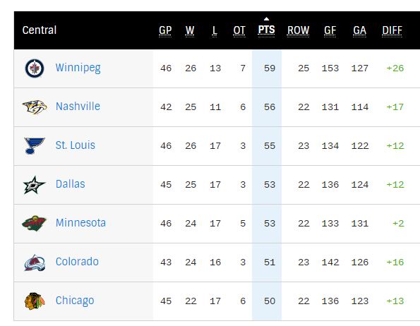 Drôle de réunion que cette division Centrale. Aux prétendants historiques Chicago, St Louis et dans une certaine mesure Minnesota, se sont ajoutés le nouvel épouvantail Nashville, le revenant Dallas, la valeur montante Winnipeg et l’outsider Colorado. Des profils bien différents donc mais qui se retrouvent après une quarantaine de matchs au coude à coude.