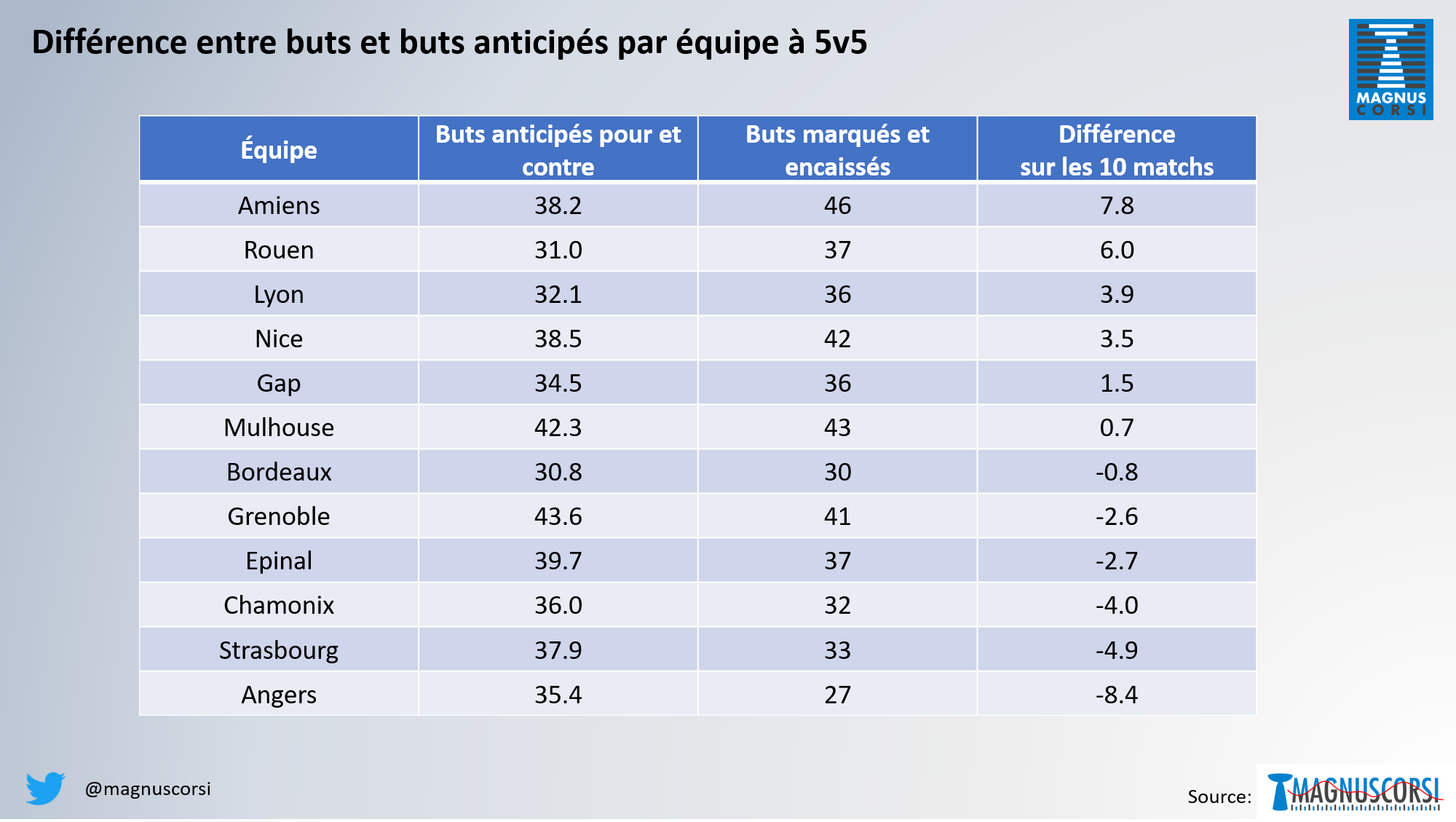 Pour finir, jetons un rapide coup d’œil sur la différence à l’issue des 10 matchs mesurés entre les buts anticipés (pour et contre) et les buts réels pour chaque équipe, à 5 contre 5.