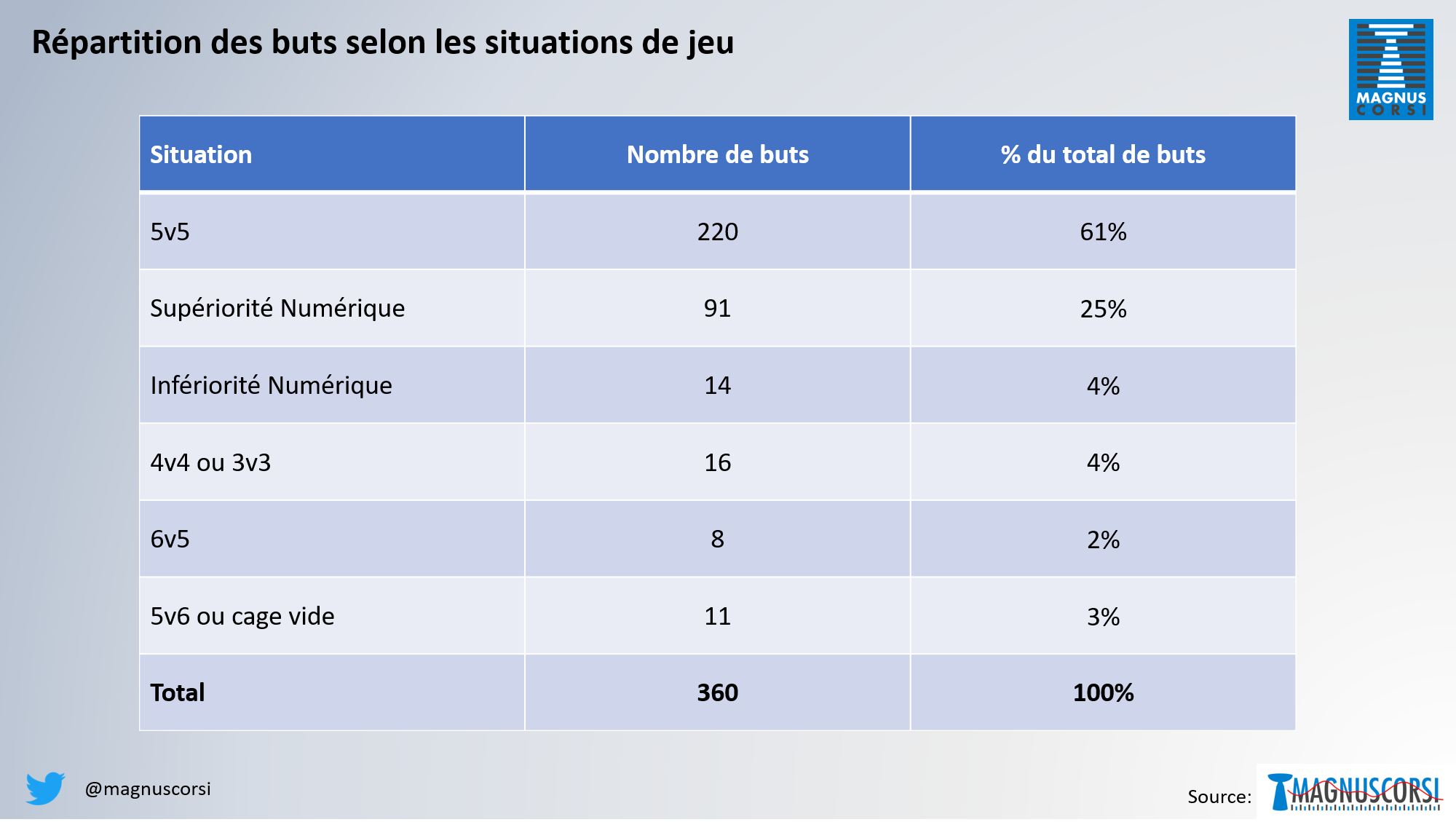 Les buts marqués à 5 contre 5 constituent 61% de l’ensemble des buts marqués. Le 5 contre 5 représente 72% du temps de jeu. Les situations de supériorité numérique comptaient, elles, pour 24% du temps mais 29% (25+4) des buts. Cela ne surprendra personne d’apprendre qu’il se marque plus de buts par minute en Power play qu’à 5 contre 5…