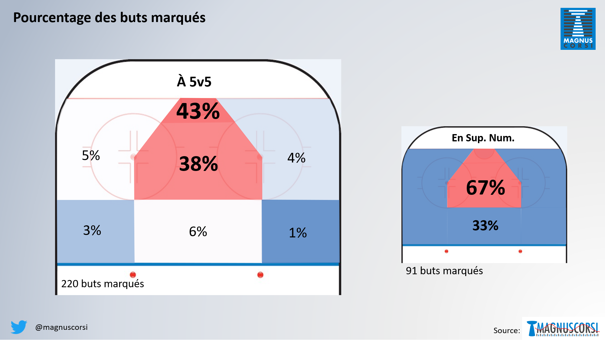 En supériorité, les buts sont l’exact opposé des tirs. Les deux tiers des buts proviennent de la zone des chances de marquer, pour un tiers des tirs tentés. Et donc inversement pour le reste de la glace.