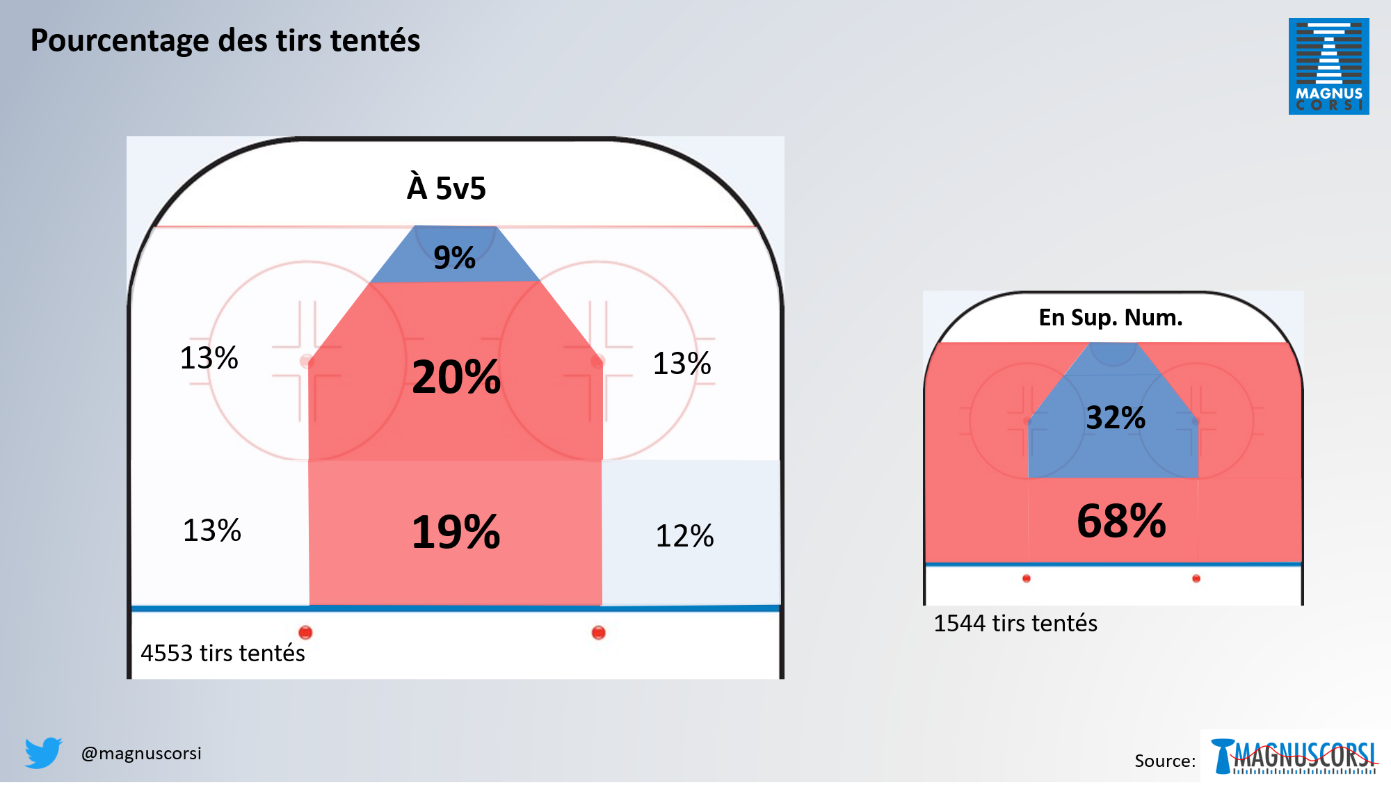 En supériorité numérique, où nous avions simplement découpé la glace en deux zones, chances de marquer et non-chances, 68% des tirs tentés venaient de la périphérie, et 32% étaient des chances de marquer. C’est donc à peine plus qu’à 5 contre 5. La difficulté à s’avancer au centre de la glace, même en supériorité numérique, demeure donc forte et les équipes s’en remettent principalement aux tirs de la pointe ou du haut des cercles.