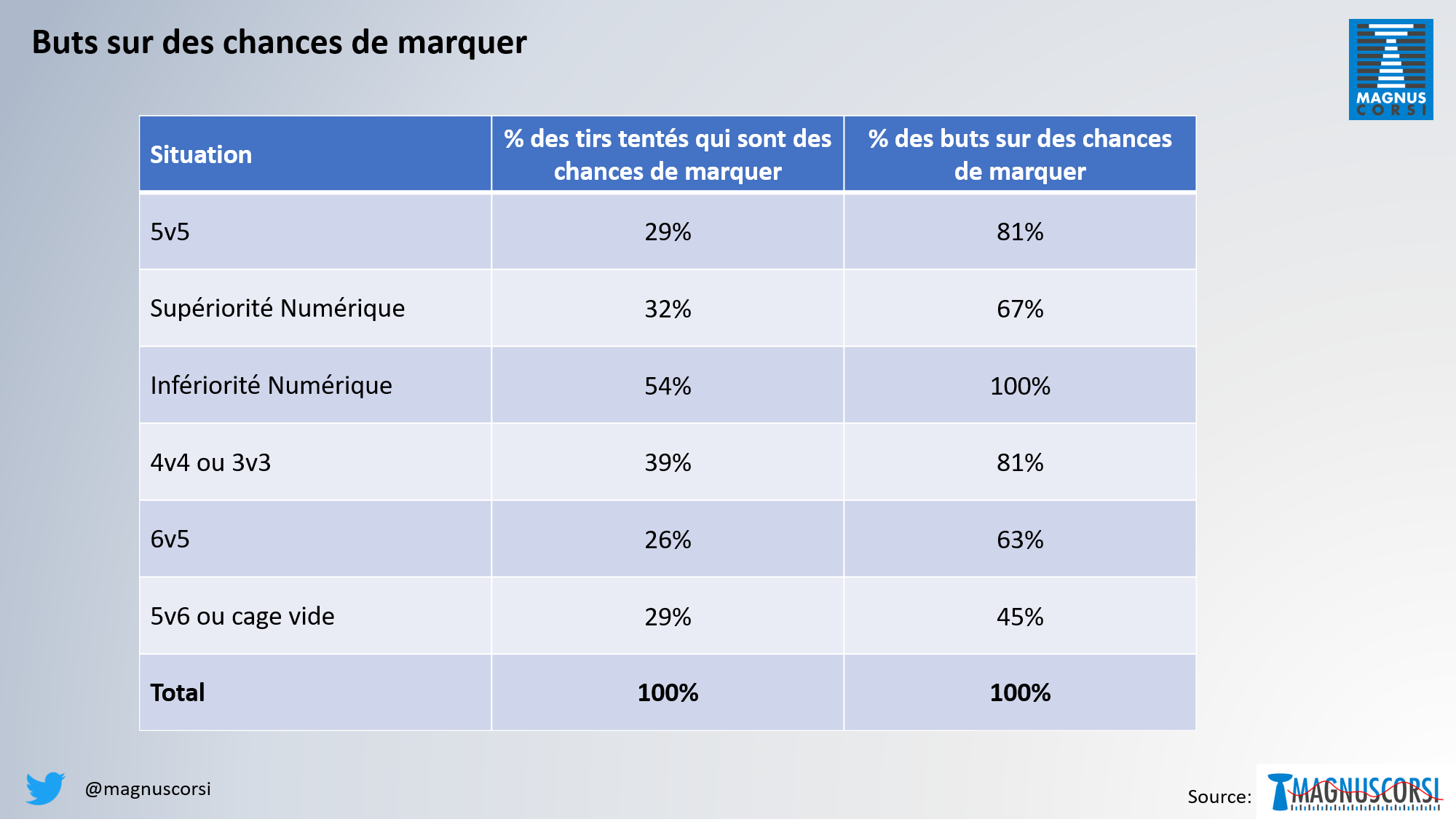 En résumé, l’importance de la zone des chances de marquer est considérable. Le tableau ci-dessous montre bien la disproportion entre le pourcentage de tirs et le pourcentage des buts provenant de cette zone. Ce constat global impacte très largement notre construction de la formule des buts anticipés comme nous allons le voir. Nous n’avons même pas vu un seul but inscrit en infériorité qui n’était pas une chance de marquer mais cela parait logique…