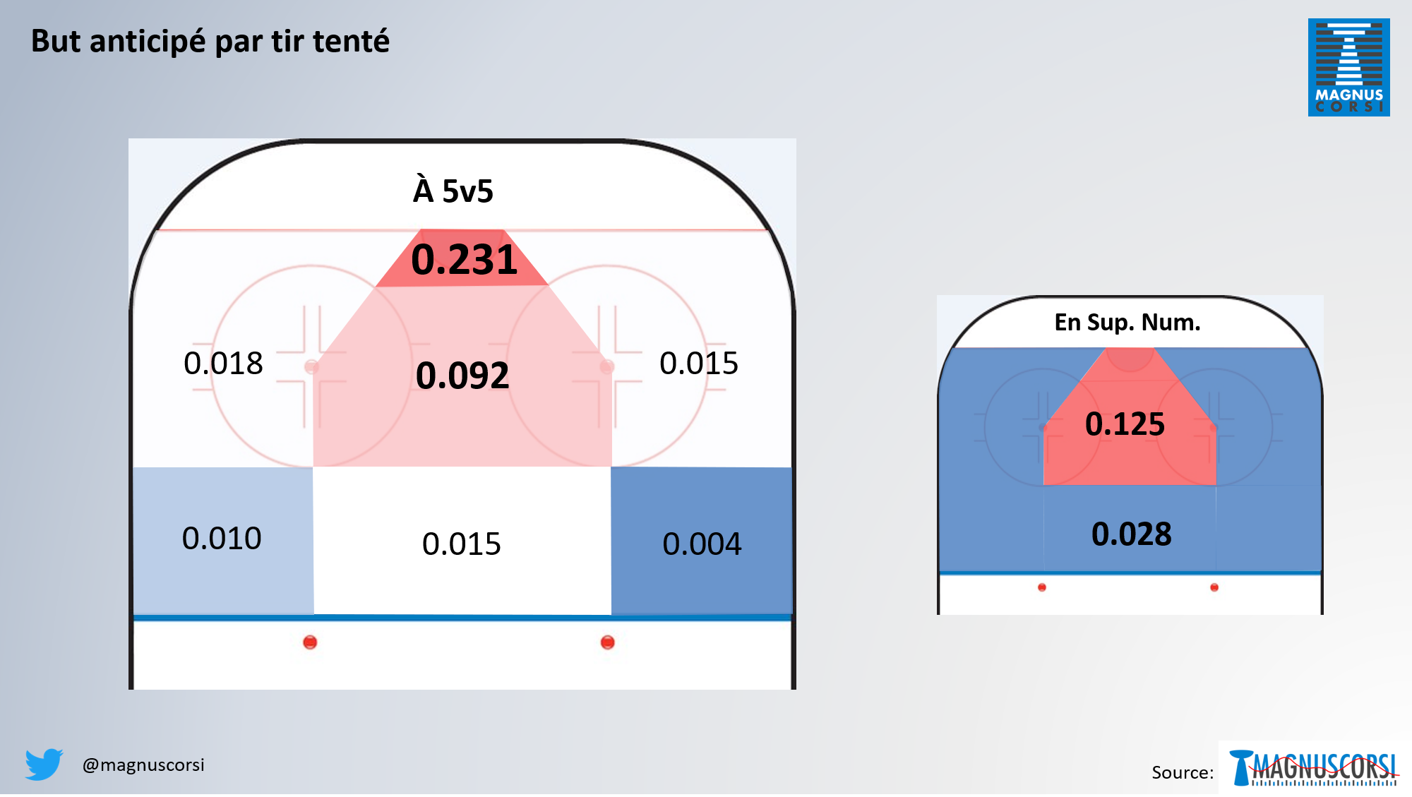 On voit donc qu’un tir tenté dans la zone high-danger vaut 0,231 but anticipé, un tir tenté entre les points de mise en jeu en vaut 0,092. C’est presque 10 fois plus qu’un tir du haut de la zone (0,015). Pour prendre un exemple concret, 23 tirs de la pointe gauche de la zone (0,01 but anticipé par tir) valent autant qu’un seul tir high-danger (0,23 but anticipé par tir)… En supériorité numérique, la zone des chances de marquer rapporte également davantage de buts anticipés et c’est logiquement toujours le cas pour les autres situations de jeu. Et si vous vous demandez combien de but anticipé vaut une chance de marquer face à une cage vide ? C’est 0,6 !