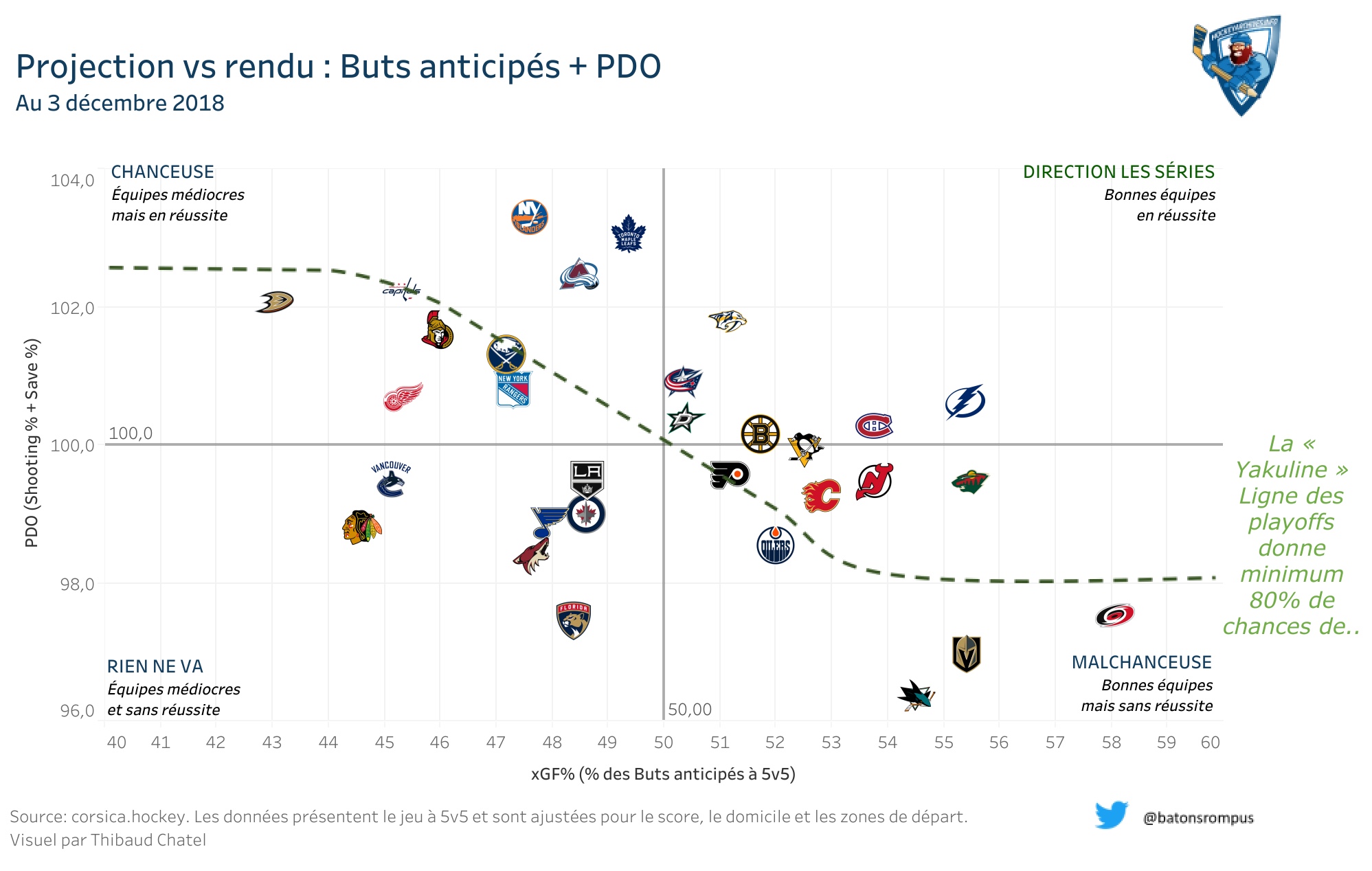 Toujours un peu plus de normalité ! Anaheim va mieux, faut croire que l’air de l’Est lui fait du bien. Les buts anticipés des Ducks remontent des abysses et Anaheim avance vers la droite. Sont quand même bons derniers de la ligue à ce chapitre, faut pas pousser non plus… Mais alors que Carolina recule vers la gauche, on pourrait presque resserrer encore l’échelle. Les Rangers passent en dessous de la ligne, Ottawa s’en rapproche, Buffalo glisse un peu, attention au syndrome post-série de victoires… Philadelphie est presque en-dessous. Les Oilers ultra-défensifs de Hitchcock remontent. Le PDO de Nashville est bien redescendu à 102 et seuls les Islanders, Toronto et Colorado font de la résistance en termes de réussite mais dans des limites désormais raisonnables entre 102 et 103.