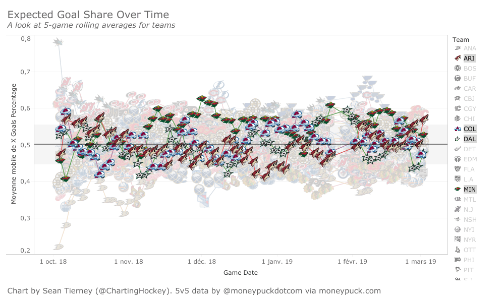 Dans l’ouest, nous n’avions jamais caché nos doutes concernant Edmonton, Chicago et Vancouver, des équipes qui n’ont pas le niveau pour réellement lutter pour les séries. Si les Oilers avaient déjà décroché depuis un moment, Vancouver tire désormais la langue avec une fiche de 2-6-2 à leurs derniers dix matchs. Pour les Blackhawks, la potion magique du PDO est épuisée. Avec quatre défaites à leur derniers cinq matchs, Chicago a désormais huit points de retard sur la 8e place (et quatre équipes à devancer en plus). Dallas arrive à garder une balance moyenne avec 5 victoires pour 5 défaites dernièrement, mais les buts anticipés chutent sur le mois de février. Minnesota est sage comme une image et continue de maudire la saison noire de ses gardiens sans laquelle ils seraient largement plus haut au classement. Colorado vivote mais la chose dont personne ne parle est que l’Arizona est ce matin à deux points des séries avec un match en moins! L’ARIZONA! Arizona qui a joué en février au-dessus de la barre des 50% de buts anticipés, Arizona qui compte toujours sur la deuxième infériorité numérique de la ligue, Arizona qui a engrangé les points contre les Vancouver, Détroit, Florida ou Edmonton de ce monde mais qui a aussi battu en février Winnipeg, Toronto ou Vegas. Darcy Kuemper joue bien dans les buts sans être réellement en surchauffe et la faiblesse de la compétition laisse tous les espoirs permis pour les Coyotes.
