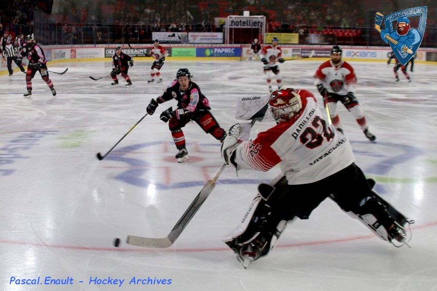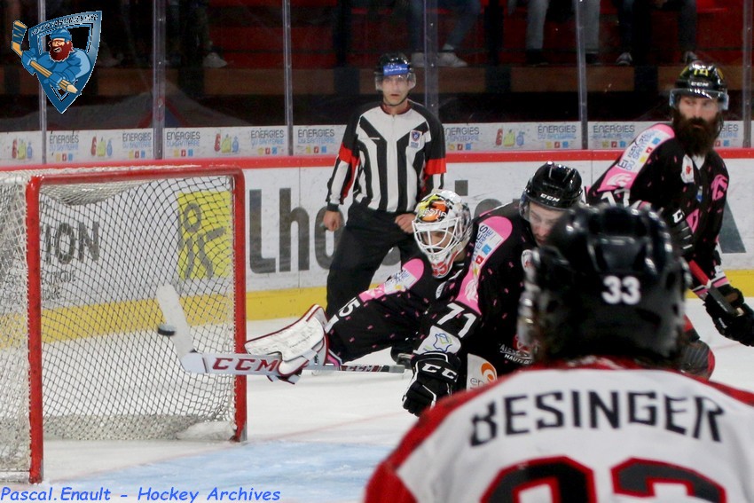 Encore une entame de période à la faveur des locaux, Florian Sabatier est proche d’offrir un quatrième but à son équipe, mais Papillon lui ferme la porte. C’est pourtant Mulhouse qui marque avec un lancer pleine lucarne de Milan Jurik (3-2, 43’01). Les Alsaciens poussent pour tenter d’égaliser, avec plusieurs tentatives du duo Vigners-Sevcenko qui se trouve les yeux fermés. Les Amiénois procèdent donc par contres, avec une énorme chance pour Baptiste Bruche qui bute sur la jambière de Papillon en face-à-face. Et quelques instants plus tard, après plusieurs lancers de suite sur la cage mulhousienne, les Scorpions craquent avec un but de l’inévitable Philippe Halley, bien servi par son compatriote Tommy Giroux (4-2, 51’34). Les Gothiques se donnent un peu d’air et maîtrisent calmement la fin de match.