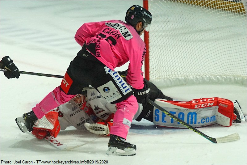 Les deux équipes ne se lançaient pas, dans cette rencontre, à cœur perdu. Mais elles travaillent douloureusement avec courage et beaucoup de solidarité. La première période, poussive, a été la moins productive en matière d’occasions. Chamonix a failli ouvrir le score, via Samuel Salonen, sur sa première supériorité (4’28), puis à parité grâce à Glévéau, sur un coup du sort (6’25). Rouen, plus détendu au fil des minutes, engagea ensuite quelques sorties offensives (Guttig contré à 6’47 et Deschamps de près à 10’17). Les locaux héritaient même d’un power-play. Joël Caron, en déviation, n’était pas loin du filet (12’01). Six secondes après le retour sur la glace du puni Santeri Saari,à la finition d’un jeu installé à cinq contre quatre, Loïc Lampérier attire le box-play des visiteurs au poteau droit et trouve une petite passe à destination de Thinel (photo ci-dessous). Le duo reformé en attaque à cinq est efficace. Le vétéran ouvre le score dans une cage ouverte (1-0 à 13’33). Chamonix enchaîne avec une deuxième infériorité. Les coéquipiers de Mathieu Briand l’annulent malgré une occasion de Koivisto (14’51). La fin du tiers est plus équilibrée car Rouen n’insiste pas. Lagarde (16’19) et Salonen (18’30) sont dangereux tandis que Joël Caron perd son duel face à un gros Sabol (17’31).