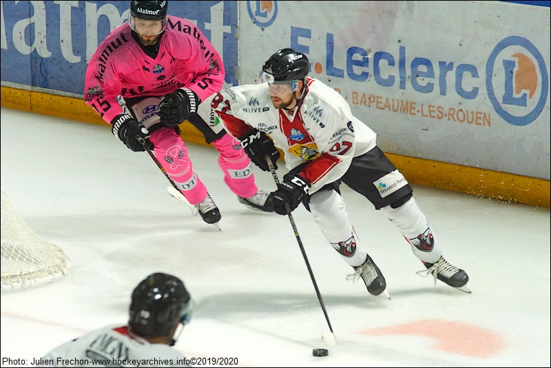 À la reprise, le jeu, toujours faible, n’est pas plus fluide. Néanmoins, les deux équipes mettent toujours de l’huile de coude dans les duels et contre les revirements. Nicolas Deschamps utilise en vain son revers (21’22), avant que Rouen n’hérite d’un troisième jeu de puissance, très peu dangereux. Plus tard, Atte Mäkinen peut tirer sur un Sabol concentré (25’13). Mais la prise de risque du tir de l’arrière, monté à mi-distance, n’est pas maîtrisé par le reste du bloc. Dans la foulée de cette occasion, les Pionniers parviennent à égaliser. Pierre Crinon, hésitant, est franchi par Widen. Bastien Maïa, forcé d’aider son défenseur, laisse Jacklin démarqué. Le Canadien, sollicité par un Widen à la très bonne lecture de jeu, fixe Mäkinen et délivre une passe à destination de Lagarde dans l’intervalle créé. L’ailier gauche égalise dans un chalut dégagé (1-1 à 25’24). Avec ce neuvième but, le Canadien de 26 ans n’est plus qu’à un seul filet des deux co-meilleurs buteurs (Vigners et Halley) de ligue Magnus !