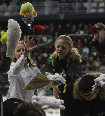 Les Jokers sortent fort du vestiaire et dominent le début de la deuxième période. Timothée Franck insiste deux fois sur passe de derrière la cage de Kerins, mais Ramon Sopko dit toujours non. La pression qui monte sur la cage nocéenne éclate même dans une empoignade au sol entre Thomas Giorgi et Danny Smith. Le Bison prend deux minutes de plus que son adversaire, et Jules Breton donne ensuite un cinglage qui fait tomber la crosse de Lorcher. Avec une minute et demie à 5 contre 3, Cergy peut prendre son temps avant de déployer une action d’école : passe de transversale de Max Kalter pour Pierre-Charles Hordelalay qui tire dans le haut du filet (1-1). C’est le moment que le public attendait pour « l’opération peluches » : elles sont si nombreuses sur la glace que les jeunes de Cergy mettront un certain temps à les évacuer malgré de l’entrain, une technique efficace et l’aide des joueurs locaux.