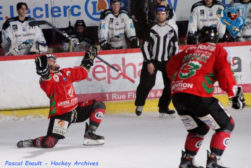 Tommy Giroux se procure la première grosse occasion, son tir du revers passe de peu à côté (60’20). Le jeu est difficilement installé dans cette disposition, le duo Giroux-Halley est proche de donner la victoire aux locaux, mais la double parade d’Ylonen empêche les Québécois de marquer par deux fois (63’21). Gap se montre dangereux en fin de prolongation avec Golicic, seul au slot, qui force Buysse à réaliser un arrêt de grande classe (64’07). Sur l’engagement qui suit, Dimitri Thillet pense avoir marqué, mais le bout de la botte droite de Buysse vient stopper le palet sur la ligne (64’20) ! Alors qu’il reste quelques secondes dans la prolongation, Tommy Giroux hérite d’un palet en zone neutre, fixe le défenseur et transmet à Louis Bélisle qui arrive lancer plein axe, libre de tout marquage, le défenseur amiénois vient, d’un tir plein de conviction, crucifier Sebastian Ylönen et les Rapaces de Gap, à seulement dix secondes de la fin de la prolongation (5-4, 64’50).