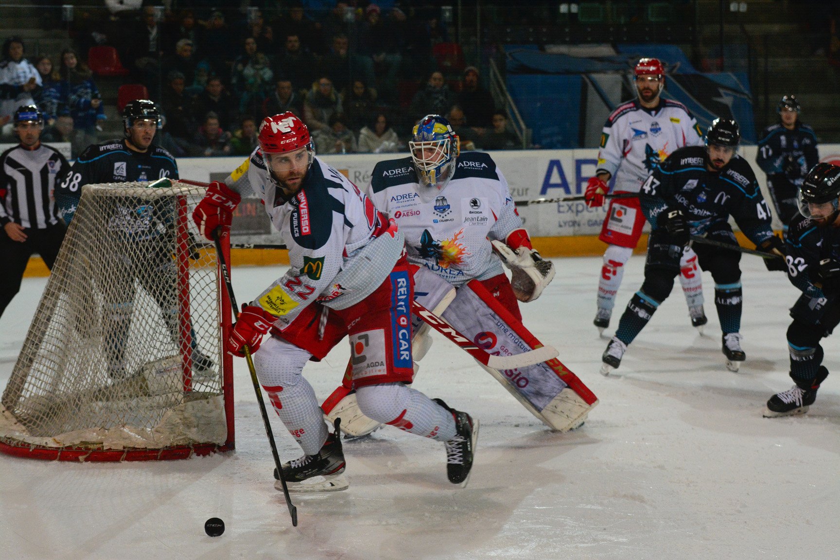 Hardy, pris par la patrouille pour son agressivité défensive, est pénalisé ainsi que Colotti pourtant victime de l’agression. Dans le public on a beaucoup de mal à comprendre les décisions arbitrales. À quatre contre quatre, c’est Rohat qui crée le premier danger en gardant son palet avec un défenseur adverse sur le dos.