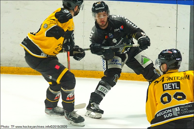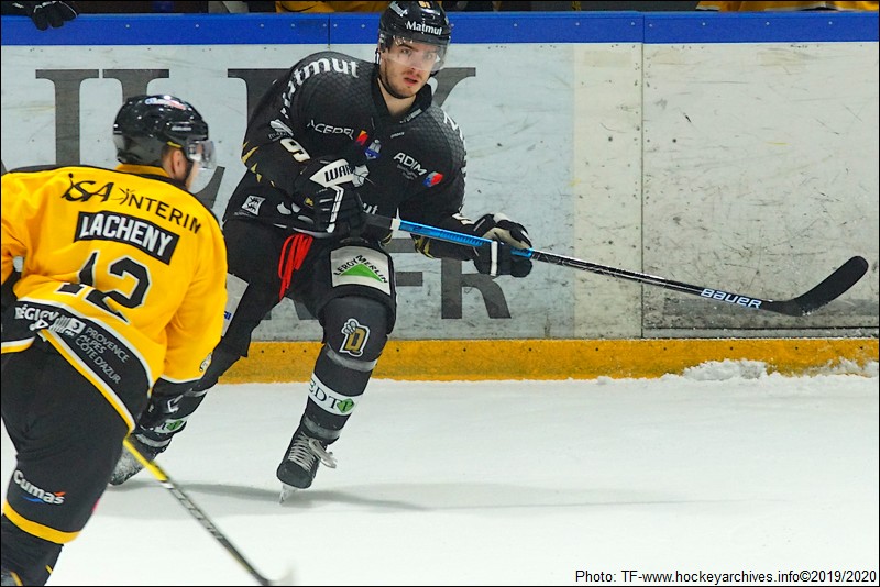 Les Aigles ont résisté le temps du premier tiers. Mieux, les visiteurs, profitant d’une certaine apathie des locaux, ont été les premiers dangereux. Loïc Chabert sera contré par les jambières de Pintaric à deux reprises (0’38 & 2’28). En supériorité aussi, les Niçois ont fait preuve d’ambition en début de match. Ils ont bataillé dans le trafic pour exploiter un rebond sur le tir de la pointe d’Emil Bagin, en vain (5’44). Leurs efforts louables n’ont pas été récompensés. Pire, contre le cours du jeu, ils encaissent injustement le premier filet de la soirée. Joël Caron dévie un lancer de Mäkinen (1-0 à 6’22). Ainsi refroidis, les hommes de Stanislav Sutor ne sortiront quasiment plus pendant 44 minutes de leur camp.