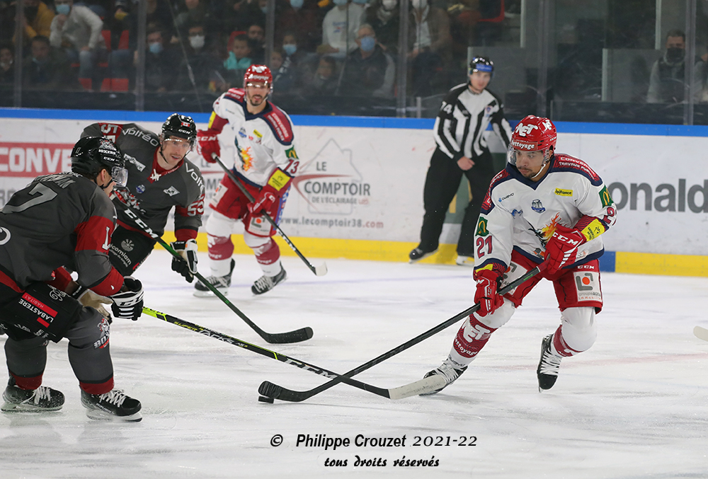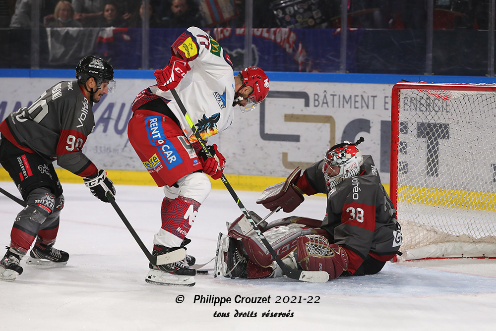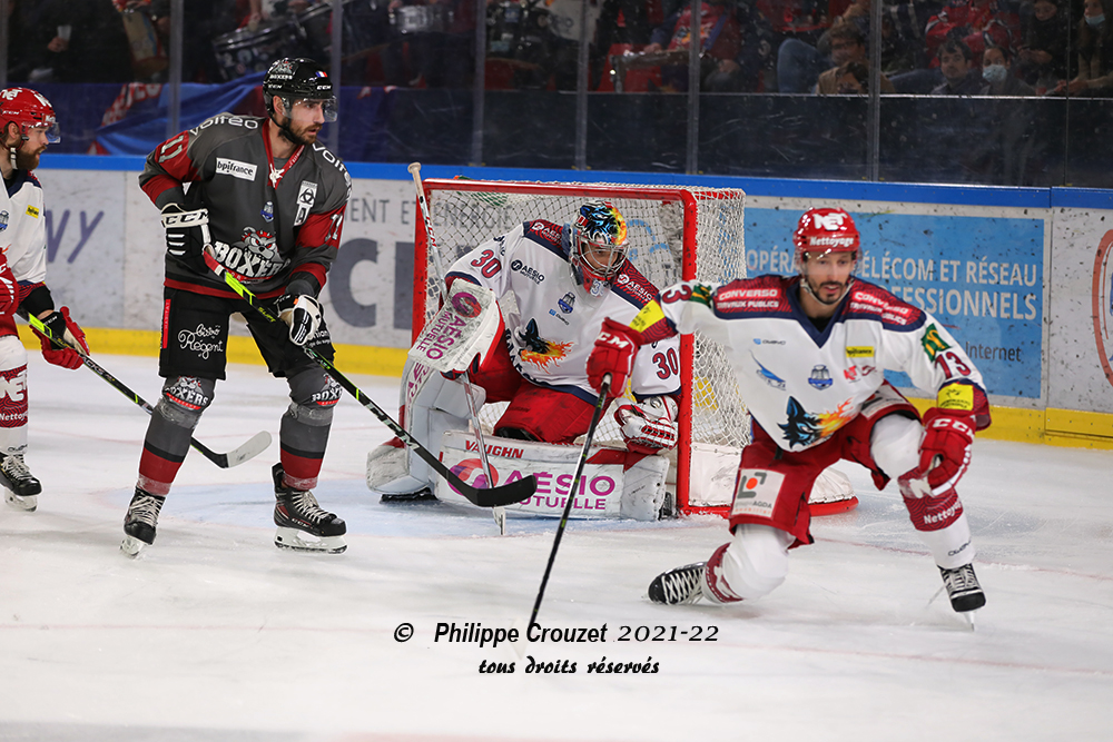 Pas grand-chose à espérer de la troisième période compte tenu de l’écart au score. Au bout de 32 secondes, Moisand se fait déjà pénaliser. Le power-play grenoblois s’installe rapidemen : sur un lancer de Hardy, Enzo Carry prend le palet dans la jambe et a du mal à se relever. Le palet circule dans les crosses grenobloises mais Bisaillon ne cadre pas son lancer et les Boxers parviennent à tuer la pénalité. Même à cinq contre cinq, Grenoble continue de faire tourner le palet en zone offensive. Munoz tente sa chance de loin d’un bon lancer frappé mais Richard détourne la rondelle.
