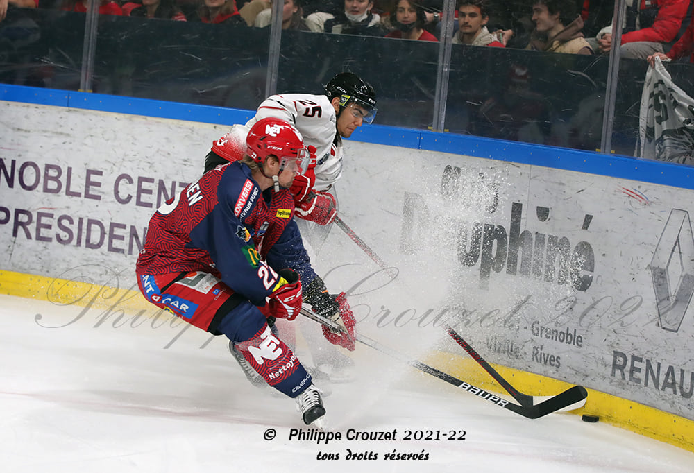 Peter Valier (attaquant de Grenoble) : « C’est un match solide qui nous donne les trois points. Ce n’est pas le match parfait, il y a encore des choses à améliorer. Défensivement, je pense qu’on peut relancer plus vite, et offensivement, je pense qu’on peut marquer plus. Il y a encore des choses à travailler, on en met cinq mais si on en met dix je pense que c’est aussi mérité avec tout le respect que j’ai pour Nice. On a énormément d’actions de buts et si on ne marque pas plus, c’est seulement un manque de réalisme qui peut nous coûter cher un jour. Il faut améliorer les détails qui font qu’on tue le match directement… Le 3-1 aurait pu se transformer en 5-0 si on avait été opportunistes et 5-0 dans la tête des adversaires, ça fait très mal. Ce sont des petits trucs à travailler, après on ne peut pas marquer tout le temps, on en est conscient, il faut aussi respecter l’adversaire qui a bien défendu mais avec les gars qu’il y a dans le vestiaire, on peut en marquer beaucoup plus. Ce sont des choses qui se travaillent en match aussi, on fait la passe de trop au lieu de tirer. Le fait d’enchaîner les matchs va permettre d’engendrer de la confiance, de régler les petits trucs qui nous manquent avant les play-offs qui arrivent. Pour moi, c’était frustrant de regarder les matchs, je suis content d’être sur la glace. Je reste patient, on gagne, j’essaie d’apporter ce que je peux à l’équipe et travailler pour être à 100% pour les play-offs. La phlébite, la veille je m’entraînais, le lendemain j’étais arrêté pour trois mois. C’est venu subitement, j’avais des fourmis dans les jambes, j’ai fait des examens et il s’est avéré que j’avais un caillot de sang dans le mollet. J’ai fait des tests pour savoir d’où ça vient mais je n’ai pas d’explication pour le moment. Mais maintenant ma santé est bonne et je peux enfin penser au hockey. »