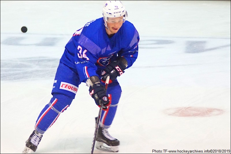 Quentin Papillon réussit une excellente deuxième période face à une pression suisse très soutenue. Il arrête notamment des tirs en très bonne position de Scherwey ou de Fuchs. L’équipe de France a peu d’occasions, mais elle se montre opportuniste en fin de tiers. Fabien Bourgeois – en photo ci-dessous – lance depuis la ligne bleue et Wüthrich perd de vue le rebond qui est resté dans ses jambières. Lou Bogdanoff est plus vif à réagir que Simon Le Coultre et marque son troisième but en 7 sélections, un beau ratio.