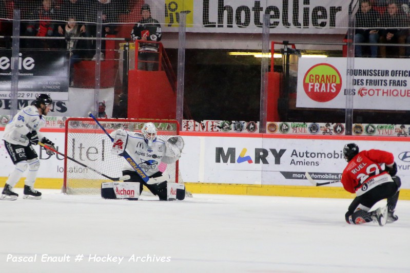Les Amiénois continuent de dominer même si parfois les Gapençais profitent de quelques contres. Altidor, Tarabusi, ou encore Golicic s’essayent en face-à-face avec Buysse. Mais le gardien picard est intraitable dans ce premier tiers et dégoûte les artilleurs des Rapaces. À quatre minutes de la fin de la première période, Morin est lancé lui aussi en face-à-face par Bruche. Il est rattrapé par la défense gapençaise mais arrive tout de même à frapper le palet. Beaucoup de talent et un peu de réussite font que cette cartouche finit également au fond des filets (4-0, 15’42). Le Coliseum n’en revient pas, le banc amiénois exulte et les Rapaces ne semblent pas avoir quitté leur nid ce soir. Les Gothiques réalisent un début de match tonitruant.