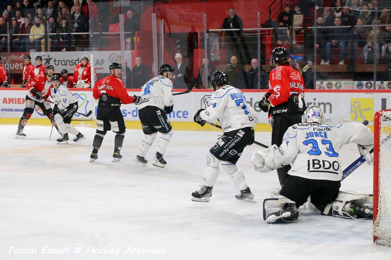 Au retour des vestiaires, Gap revient avec de meilleures intentions. Le palet est gardé en zone offensive et une pluie de tirs s’abat sur Buysse qui doit sortir le grand jeu pour garder sa cage intacte. Gap mène la danse mais va se faire surprendre, une fois de plus. Jago récupère un palet en zone offensive, l’envoie très rapidement sur Morin qui voit le serial buteur amiénois Bouchard en position de tir. Il passe ce palet et laisse la magie du Canadien opérer. Un missile surpuissant vient se loger dans la lucarne droite de Junca, décidément pas en forme (5-0, 23’35). Les Gothiques collent la Manita aux Rapaces en ce début de deuxième tiers-temps. Gap doit absolument se ressaisir et c’est ce qui va être fait. À la vingt-sixième minute, les visiteurs obtiennent leur premier power-play. Le jeu est fluide, les passes s’enchaînent, Thillet envoie un bon palet vers l’enclave qui est très intelligemment dévié par Joubert. Buysse ne peut cette fois rien y faire, et les Rapaces ouvrent leur compteur (5-1, 27’17).
