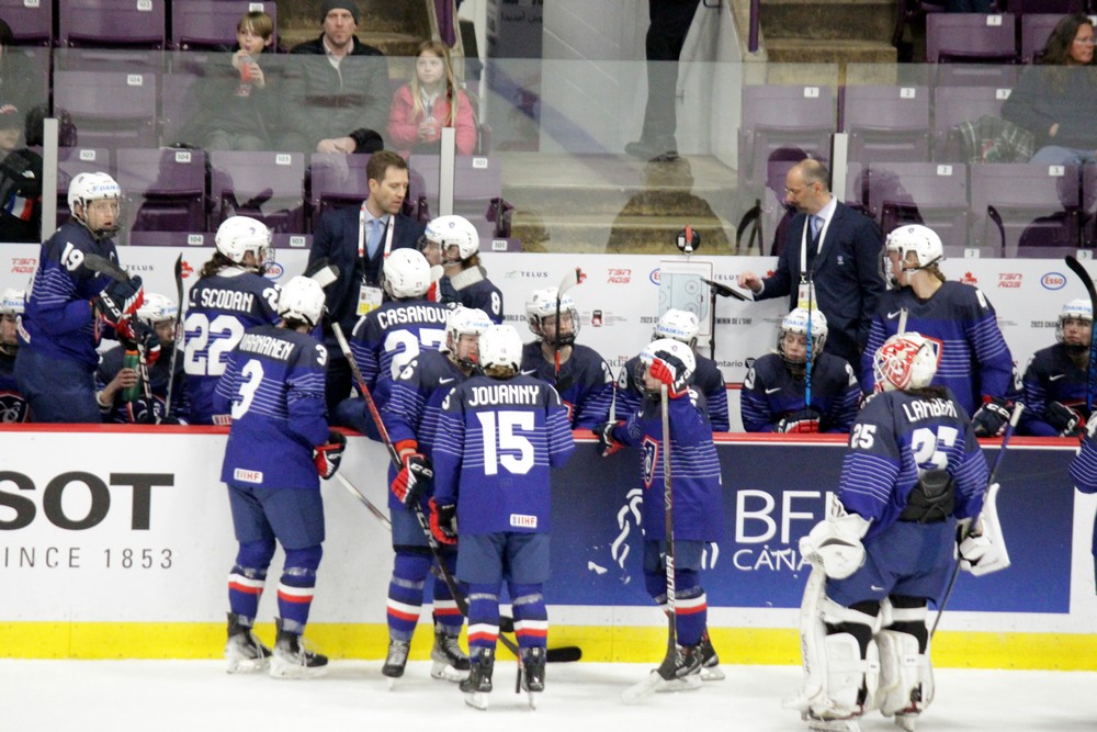 Étrillées par la Finlande, les Tricolores veulent vite réagir. Si Lore Baudrit gagne son duel de « pierre, feuille, ciseau » avec Taylor Baker pour avoir le droit de quitter la glace en dernière après l’échauffement, il n’y a pas d’amusement d’entrée dans la rencontre. Il faut dire que les deux camps disposent de soutiens nombreux en tribunes, transformant en ambiance européenne une arena plus spectactrice d’ordinaire.