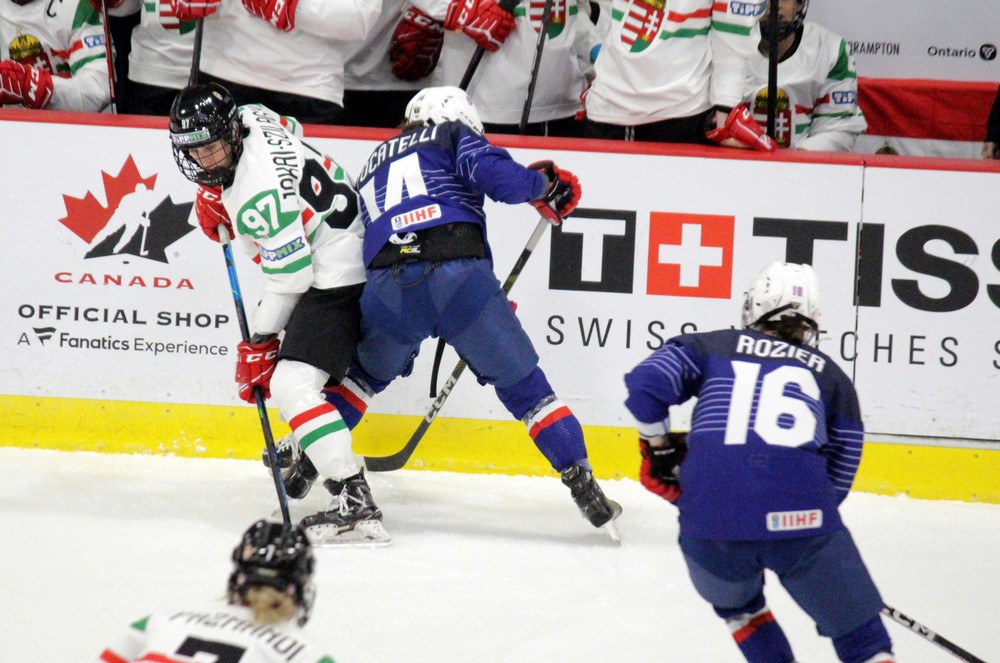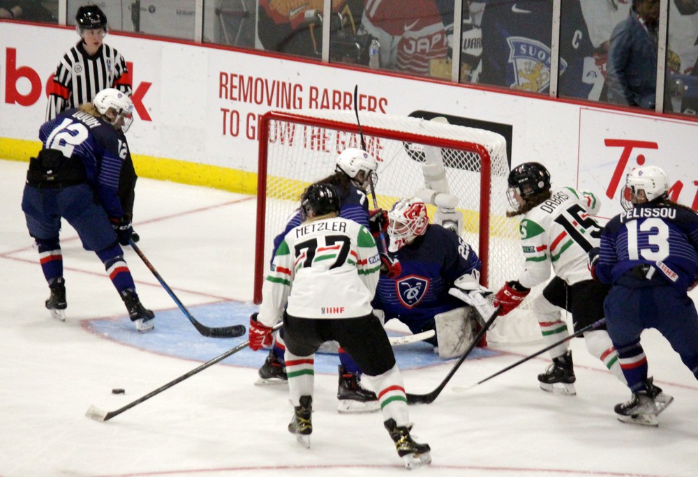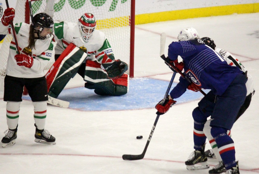 Les Bleues cafouillent un peu le palet dans les premiers instants. Ces revirements offrent les premiers tirs sur Caroline Lambert. Au fil du temps, la France se relève. Sur une mise au jeu gagnée par Duvin, Aurard s’offre la première chance. Malheureusement, après cinq minutes de jeu, la Hongrie exploite une faille. Une longue passe dans le dos de la défense envoie Huszak en échappée. Lambert remporte son duel mais l’attaquante hongroise garde le palet, efface Pelissou dans le coin et lance dans un angle fermé… piégeant la portière tricolore (0-1).