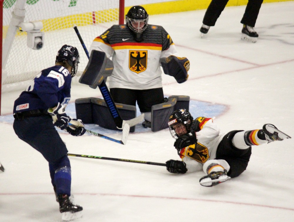Les minutes défilent et l’Allemagne n’a plus vraiment de possession de palet. L’occasion pour l’arrière Krista Parkkonen de partir à l’attaque et servir Noora Tulus, dont le tir ne trouble pas May. Une pénalité de Ronja Hark fait encore reculer l’Allemagne, avec un débordement en force de Petra Nieminen sur l’aile droite. Elle attaque la cage et le rebond est dégagé.