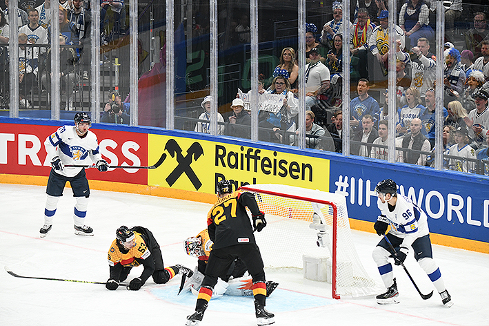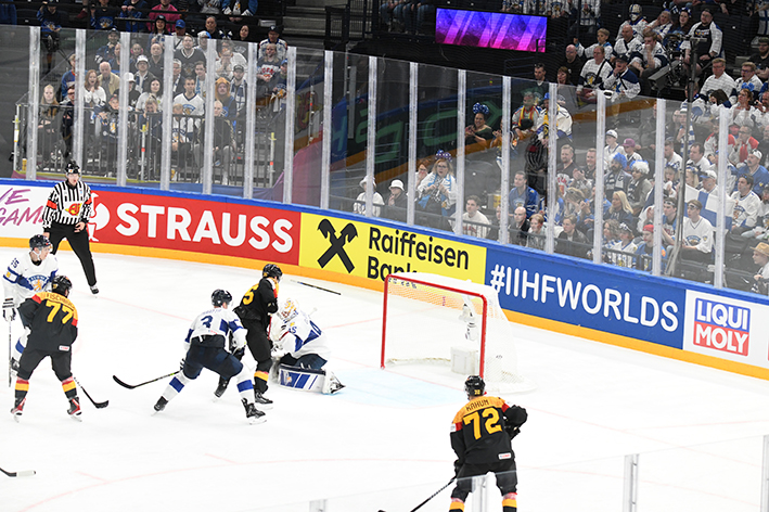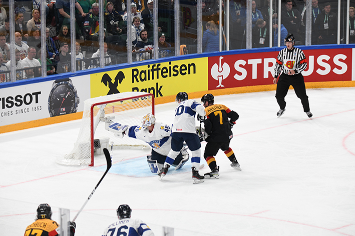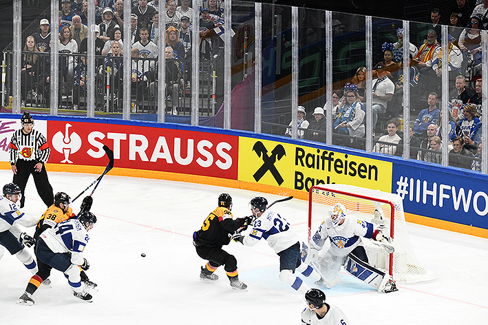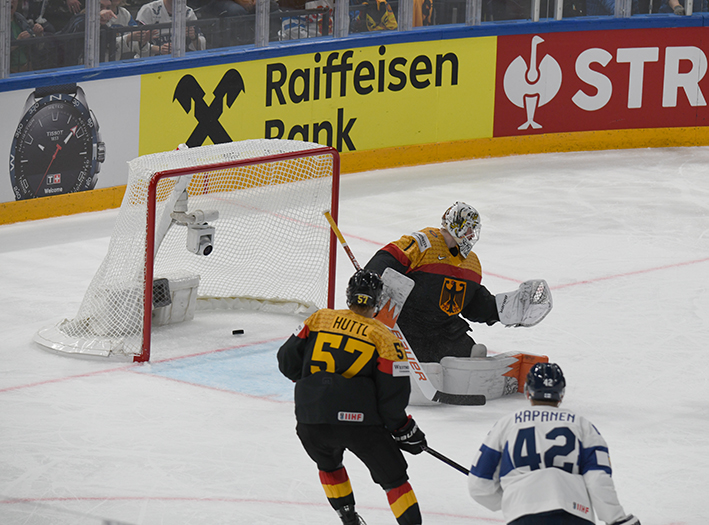 L’échec-avant des joueurs de Jukka Jalonen perturbe grandement la défense allemande, qui prend parfois des risques démesurés plein axe. Et après dix minutes, Kaapo Kakko mystifie Kai Wissman d’un pivot astucieux et, du coin, sert en retrait Joel Armia. Du cercle, le joueur de Montréal reprend sans contrôle et Strahlmeier ne parvient pas à bloquer sous la jambière (0-1).