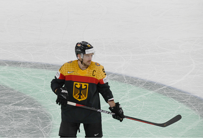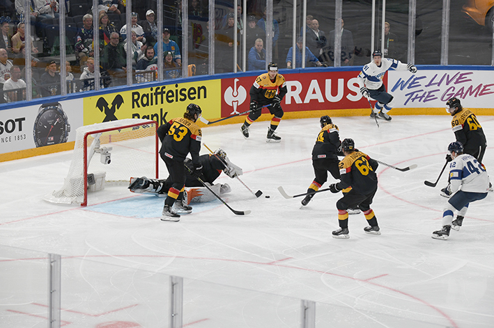 L’Allemagne réplique par Fabio Wagner, dont le lancer de la bleue, croisé, force Jussi Olkinuora à un grand écart pour sortir le palet du bout de la jambière. Justin Schütz enchaîne sur l’aile gauche, profitant d’un changement de ligne un peu lent de la Finlande. C’est un temps fort allemand.